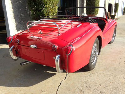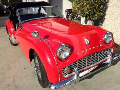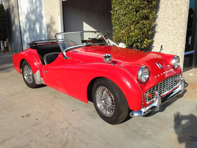 1962 Triumph TR3. B. Red, black interior with chrome wire wheels. a good clean little classic with patina. convertible top and tonneau cover, just had new front brake calipers, new rear brake shoes, new master cylinder, new clutch hydraulics, est. $3000 worth the engine compartment is very clean. Speedometer shows 33,900 miles but we cannot guarantee as we don't have history paperwork vin # TS68984L. Please call Roy 619 708 3180. by appointment only.