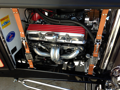 Engine/Engine Compartment: No signs of oil leakage, seeping or dripping. Engine compartment looks nice with custom parts on engine and engine bay, with all parts in place, and looks good and clean. Everything in engine compartment in good condition: Ignition, wires, plugs, belts, hoses, clamps, filters, pumps, cables, battery, alternator, brake master, etc. Radiator aluminum oversized and in good condition. Vehicle has oil pan, exhaust into mufflers. Three speed automatic transmission in good condition.