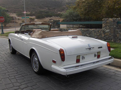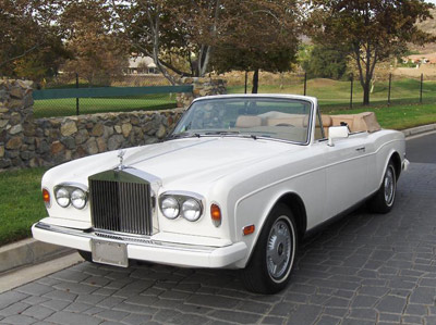 1985 Rolls Royce Cornishe II convertible, white with tan Connelly leather. What a Beautiful car with only 49,500 miles from new. Twin cocktail cabinets with glasses. All the usual power options, windows, seats, top, steering and brakes. Air Conditioning. The pictures say it all. Used mainly in Beverly Hills, CA